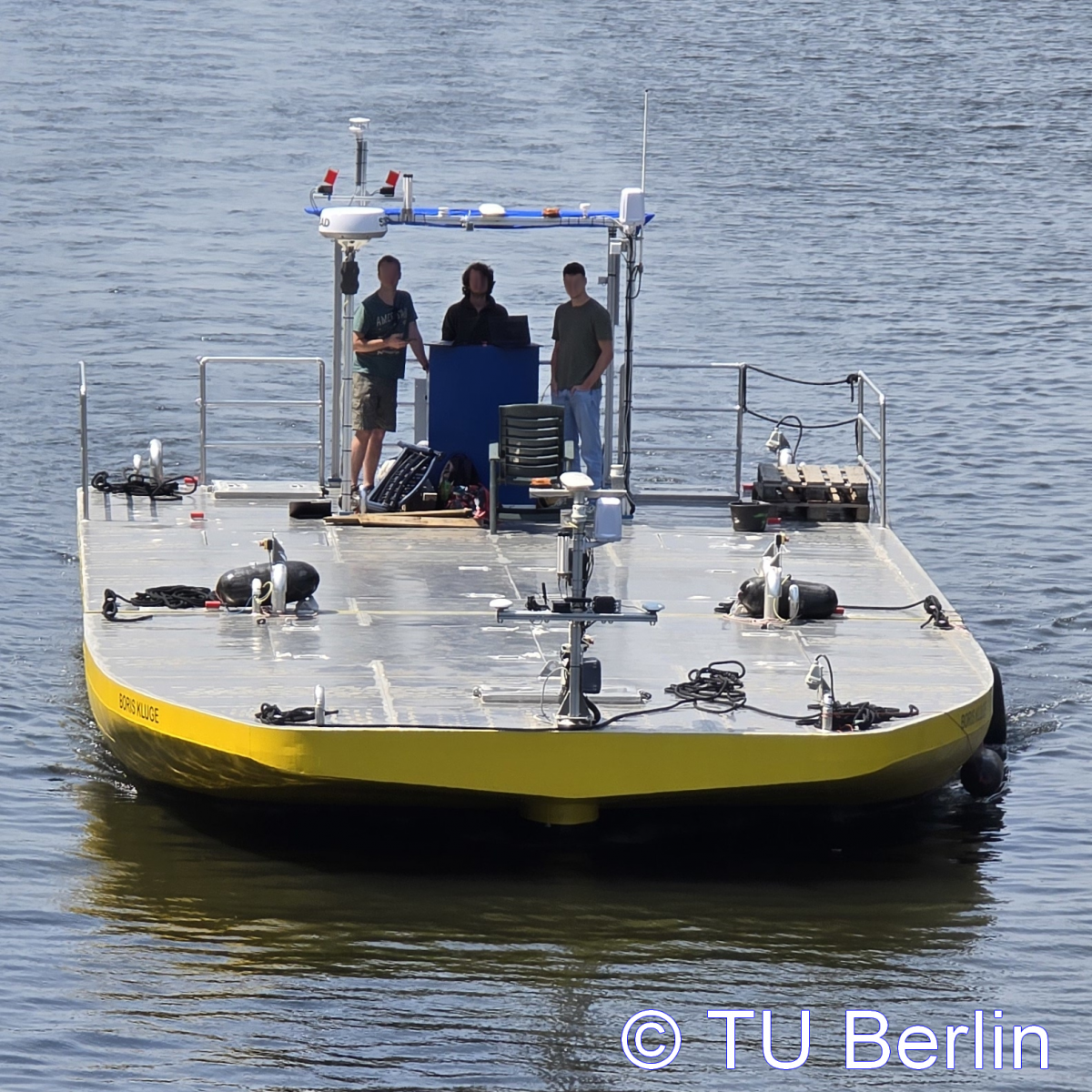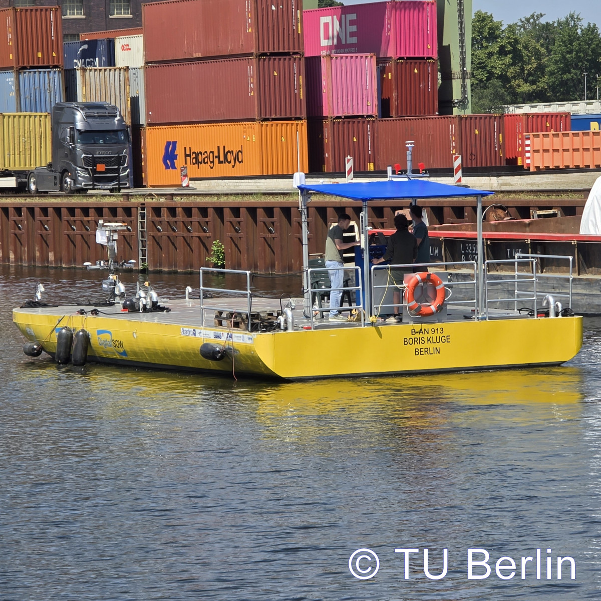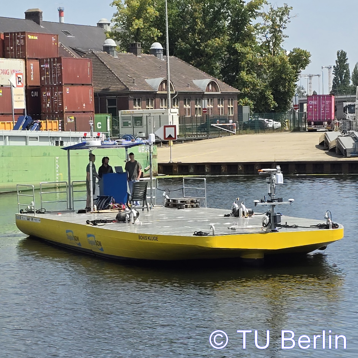 Entwicklungszeitraum 06/2021–06/2024 Koordination Alberding GmbH Themenfelder Automatisierung, Antriebssysteme & Kraftstoffe, Innovative Schiffskonzepte, Transportlogistik & Umschlagskonzepte Partner Institut für Kommunikation & Navigation des Deutschen Zentrums für Luft- & Raumfahrt e.V., Schiffbau-Versuchsanstalt Potsdam GmbH (Entwurf & Konstruktion), Fachgebiet Entwurf und Betrieb Maritimer Systeme der Technischen Universität Berlin (Eigner), Institut für Automatisierungstechnik der Universität Rostock sowie Verein für europäische Binnenschifffahrt und Wasserstraßen e.V. Demonstratortyp Projektbezogener Demonstrator Nutzungskonzept Reiner Forschungsbetrieb (keine gewerbliche Nutzung) Förderprogramm BMV / Förderrichtlinie digitale Testfelder an Bundeswasserstraßen (DTW) Förderkennzeichen 45DTWV002 Status in Betrieb Der Versuchsträger „Boris Kluge“ wurde im Rahmen des Projekts DigitalSOW entwickelt, gebaut und erfolgreich ersterprobt. Mit ihm wird eine Demonstrationsplattform für praktische Tests eines innovativen Binnenschiffstransports speziell für die Ver- und Entsorgung von Metropolregionen bereitgestellt. Der Fokus liegt auf der Erforschung und Erprobung emissionsfreier, intelligent vernetzter automatisiert fahrender Fahrzeuge. Der modular aufgebaute Versuchsträger besteht aus einem Bug- und Heckteil, die sowohl einzeln als auch im Verbund agieren können. Sie lassen sich zu größeren Einheiten koppeln und wieder entkoppeln und sind mit modernster Sensorik ausgestattet.